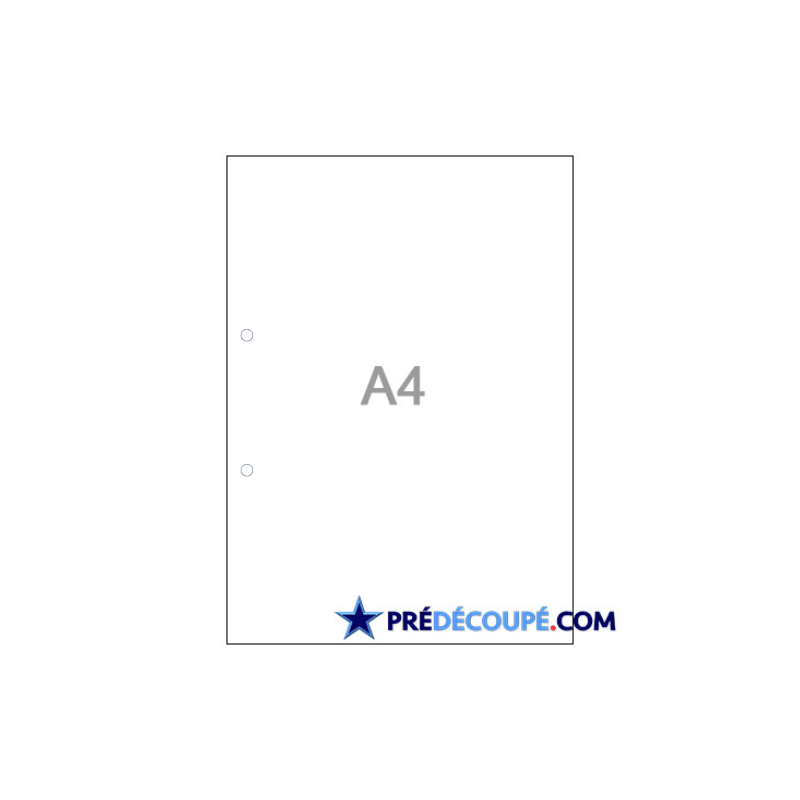 Blank A4 sheets with 2 lateral hole perforations (21cm x 29,7cm) color: white. Order from 50 units. From 80 g to 210 g. Suitable for all printers. Ideal for displays, menus, cards, note-taking, archiving, filing.