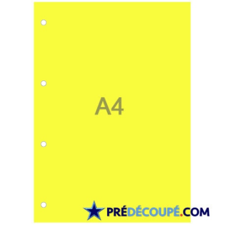 Feuille A4 perforation 4 trous latéraux (21cm x 29,7cm) couleur : fluo jaune. Commandez à partir de 50 unités. De 80 g à 210 g. Pour grands classeurs, archivage, classement.